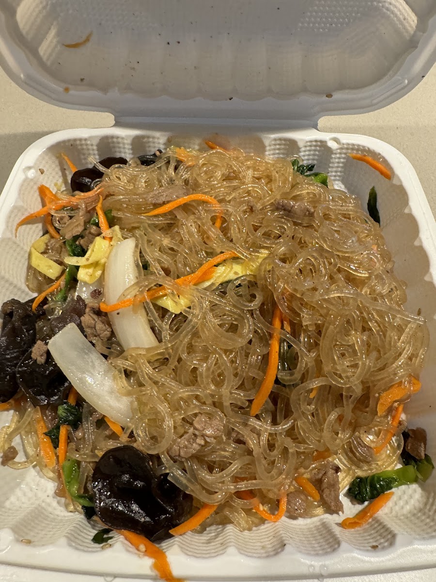 Japchae: Stir-fried glass noodles with vegetables, a savory and satisfying option.